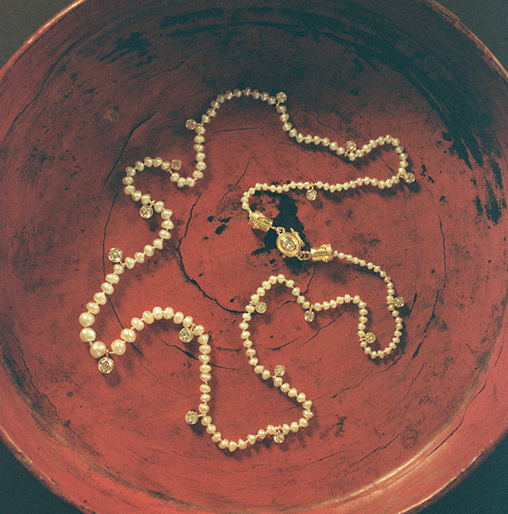 The Graduated Natural Basra Pearl Diamond Veil Necklace is handcrafted using ancient goldsmithing techniques dating back to the 3rd–5th century BCE. Each gold disc is individually formed and fused by hand. The strand features natural pearls, formed entirely without human intervention. Every piece is hand-fabricated by Jake in his New York City studio.